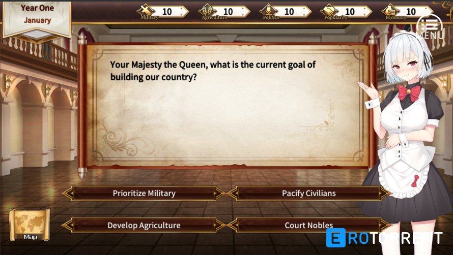 Queen's Glory - это хентай симулятор свиданий в роли принцессы Королевства. В начале игры принцесса не высокого уровня. В игре также есть легкий выбор конечностей и несколько концовок. Основной игровой процесс очень похож на «Три королевства»: каждый месяц мы имеем дело с государственными делами, такими как бегство беженцев, освоение сельскохозяйственных угодий, платные ли налоги, устранение власти дворян и т. д.
